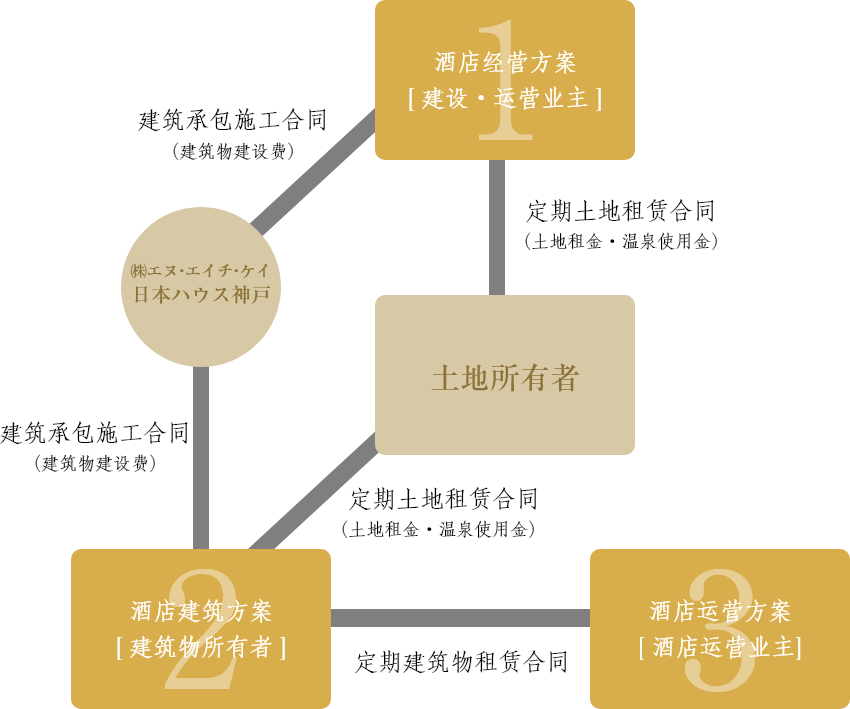 - 具有酒店管理经验的事业公司将与土地所有者签订定期土地租赁合同,进行酒店的全部建设和经营。